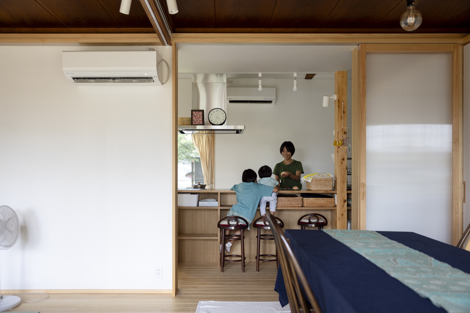 また、かつての和室二間の壁を取り払い、縁側までひと続きにしたフロアへと刷新。家族が自然と集まり、思い思いの時間を過ごせる場が生まれた。「床材には、香川県産ひのきを使っているんです」と祥乃さん。足元からふわりと香る木のぬくもりが、日々の暮らしを静かに支えている。