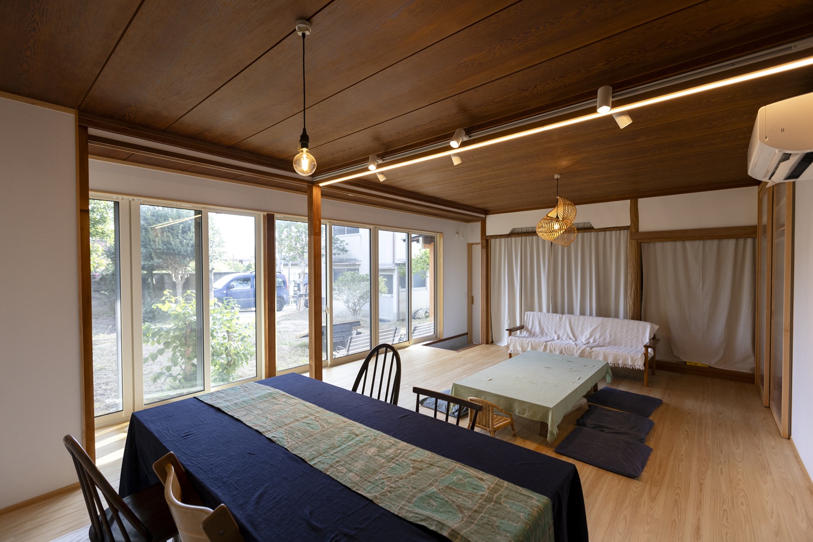 リノベーションを依頼したのは、建築家の齊藤正さんと彩工舎によるタッグ。建築当時としては珍しく、壁が少なく、開口部が多い構造だったため、まずは耐震診断を実施し、現行の基準に合わせて丁寧に補強を施した。重厚感のある瓦屋根は、軽量なガルバリウム鋼板へと葺き替えられた。施工を担った彩工舎の射場さんは、施主と建築家との対話を重ねながら、耐久性と、場所ごとの使い勝手、そして既存の雰囲気を壊さない家づくりを心がけたと話す。大きな間取りの変更こそはなかったものの、西側の応接間と洋間を事務所にしたことで、キッチンやリビングといった生活空間とは、ゆるやかに分けることができた。
