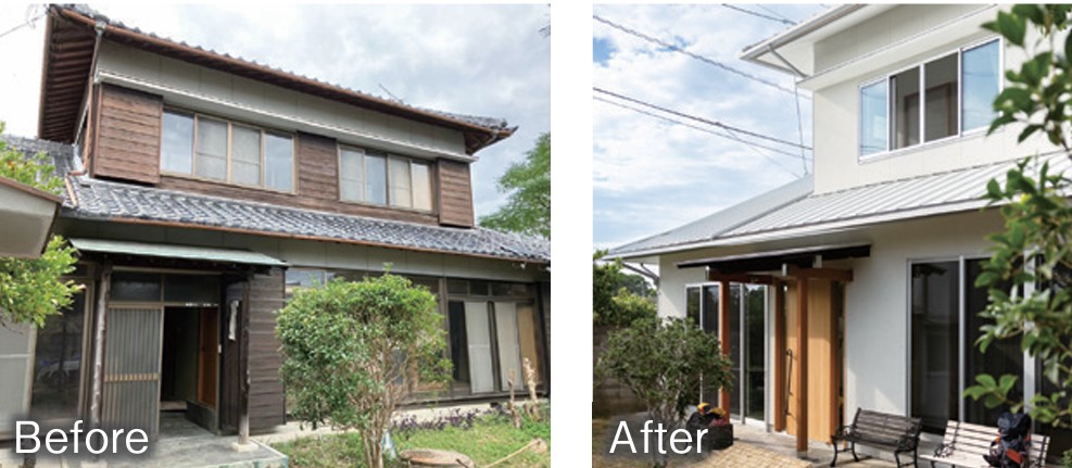 稲穂が実る、のどかな田園風景が広がる高松市郊外。その一角に「ホワイトベース」と名付けられた家がある。その名の通り、白く塗り替えられた外壁と屋根に、木製の玄関扉がアクセントになっている。シンプルながらも温かみを感じさせる、丁寧にリノベーションされた住まいだ。