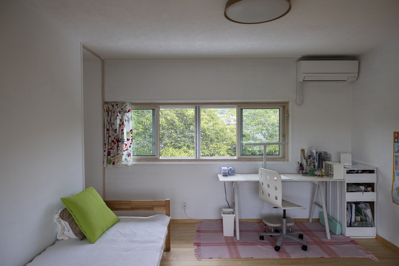 2階の部屋は、家族みんなでリノベーション。春には、窓一面に満開の桜が広がる、青笹ちゃんお気に入りの部屋