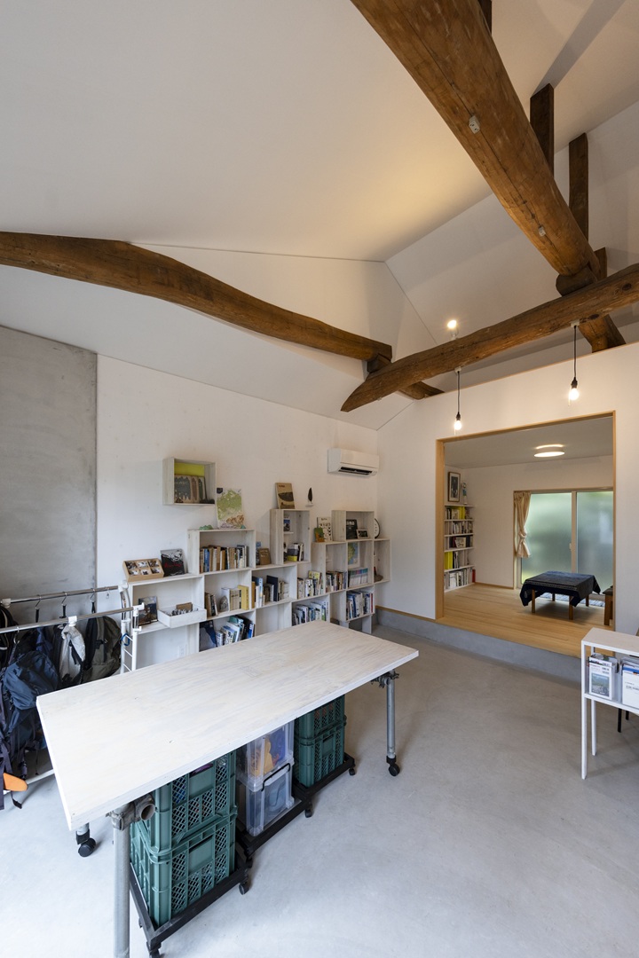 右:事務所は靴のまま出入りできるように、モルタル敷きの土間にした。壁には、祥乃さんのお父さま手づくりの本棚を設置
