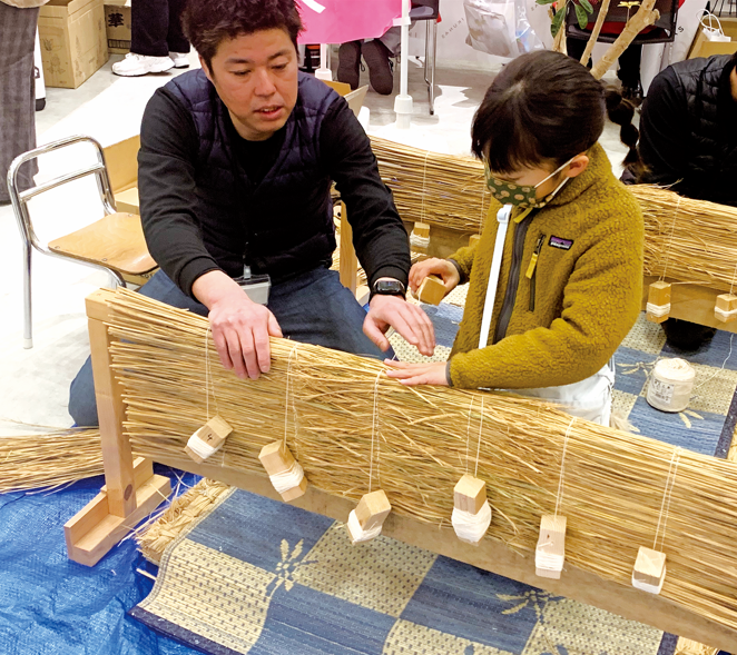 こも編みは、わら細工の伝統的な技法。 ござやすだれもこも編みでつくられています。 畳職人と一緒にこも編み体験をしてみよう。