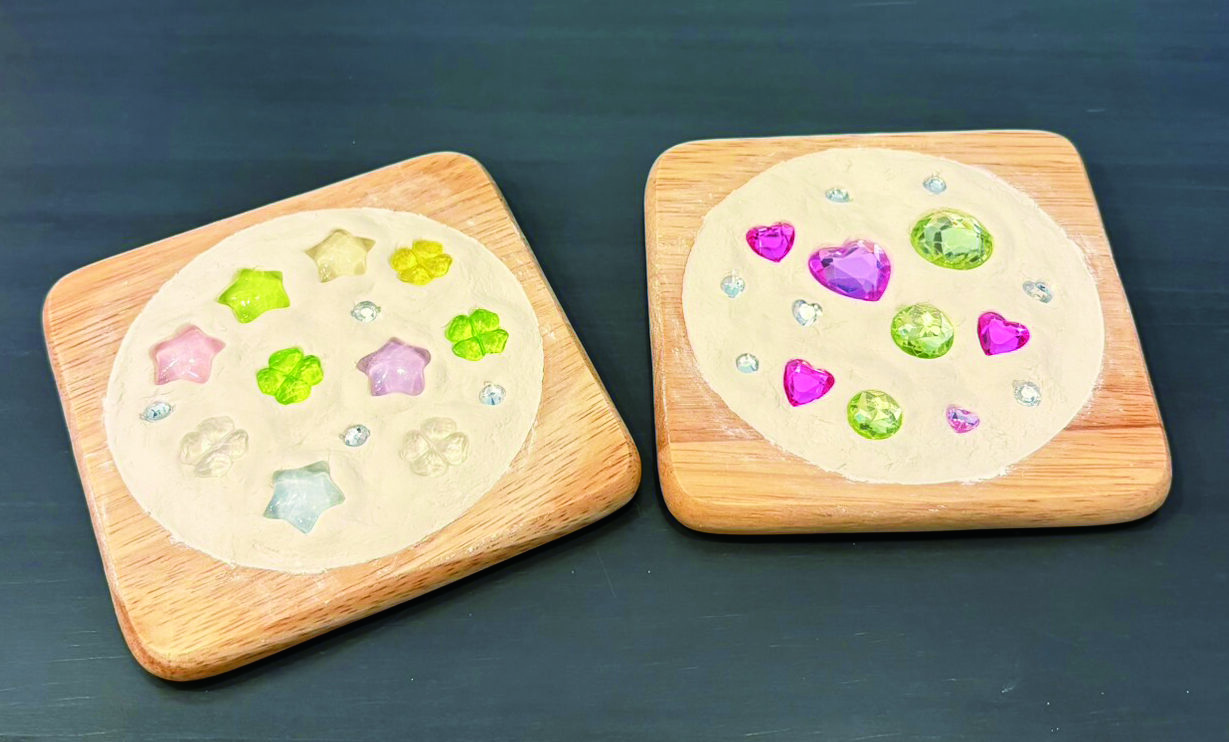石粉ねんどを敷き詰め、お好みのビーズやシールを並べてデザインします。あなただけの素敵なコースターを作ろう