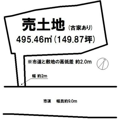 - 全面道路との高低差2.0m 土地売 古家あり 現況渡し/ くらしの不動産(株)八百万/香川県三豊市詫間町詫間889-1/TEL0875-23-7907/香川県知事免許(1)第4684号/更新日2026年2月27日/次回更新予定日2026年3月31日