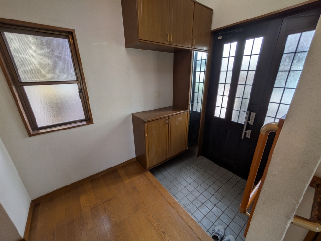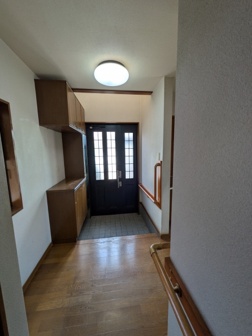 吹き抜けのある玄関。平成建築の中古物件です。内装を中心にリフォームをお勧めしますが、トイレ・ユニットバス・洗面化粧台・IHクッキングヒーターは数年前にリフォームされておりきれいです♪お問合せください♪